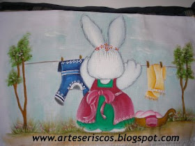 * Pano de prato com o tema de Coelha estendendo roupas (Esse pano de prato foi pintado por mim)