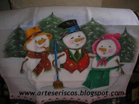 * Pano de prato com o tema de Bonecos de Neve (Esse pano de prato foi pintado por mim)