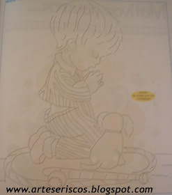 Menino: amarelo pele misturado com branco, sombrear com siena natural misturado com caramelo; cabelo: clareador com amarelo pele, amarelo ouro, siena natural, sépia; sapato: clareador amarelo ouro, siena natural, sépia, branco; pijama: clareador com amarelo ouro, sombrear com siena natural, iluminar com amarelo ouro e branco juntos no pincel, listras em cerâmica; meia e gola: branco