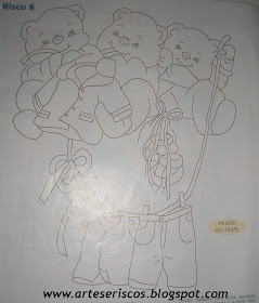 Urso 3: clareador com amarelo pele, sombreado com siena natural, rosa chá (para as bochechas); orelhas: branco sombreado com rosa chá; olhos e nariz: preto, branco para iluminar; blusa: clareador com azul bebê sombreado com azul turquesa, iluminar com branco; calça: clareador com azul mar sombreado com azul marinho, iluminar com branco