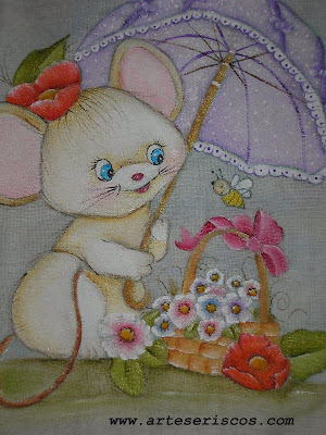 Ratinha: branco metálico, branco sombreado com siena e sépia, rosa chá; Orelha: branco metálico, branco e rosa chá. Nariz e boca: púrpura. Olhos: branco metálico, branco, azul e preto. Rabinho: branco metálico, caramelo sombreado com cerâmica. Flor da cabeça: branco metálico, amarelo ouro e vermelho vivo. Guarda-chuva: branco metálico, lilás bebê sombreado com violeta cobalto (bolinhas em branco). Babado: branco metálico, branco sombreado com violeta cobalto (bolinhas em violeta cobalto). Laço: branco metálico e violeta cobalto; Cabo do guarda-chuva: branco metálico, siena natural e marrom