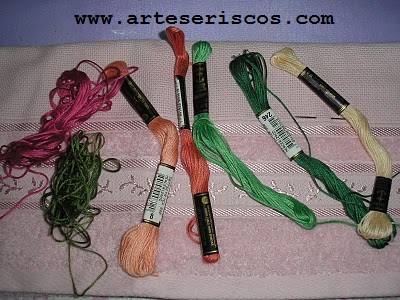 Rosa e Botões: linhas nas cores de nºs 10 (salmão escuro) e 8 (salmão); contorno: linha na cor de nº 403 (preta)